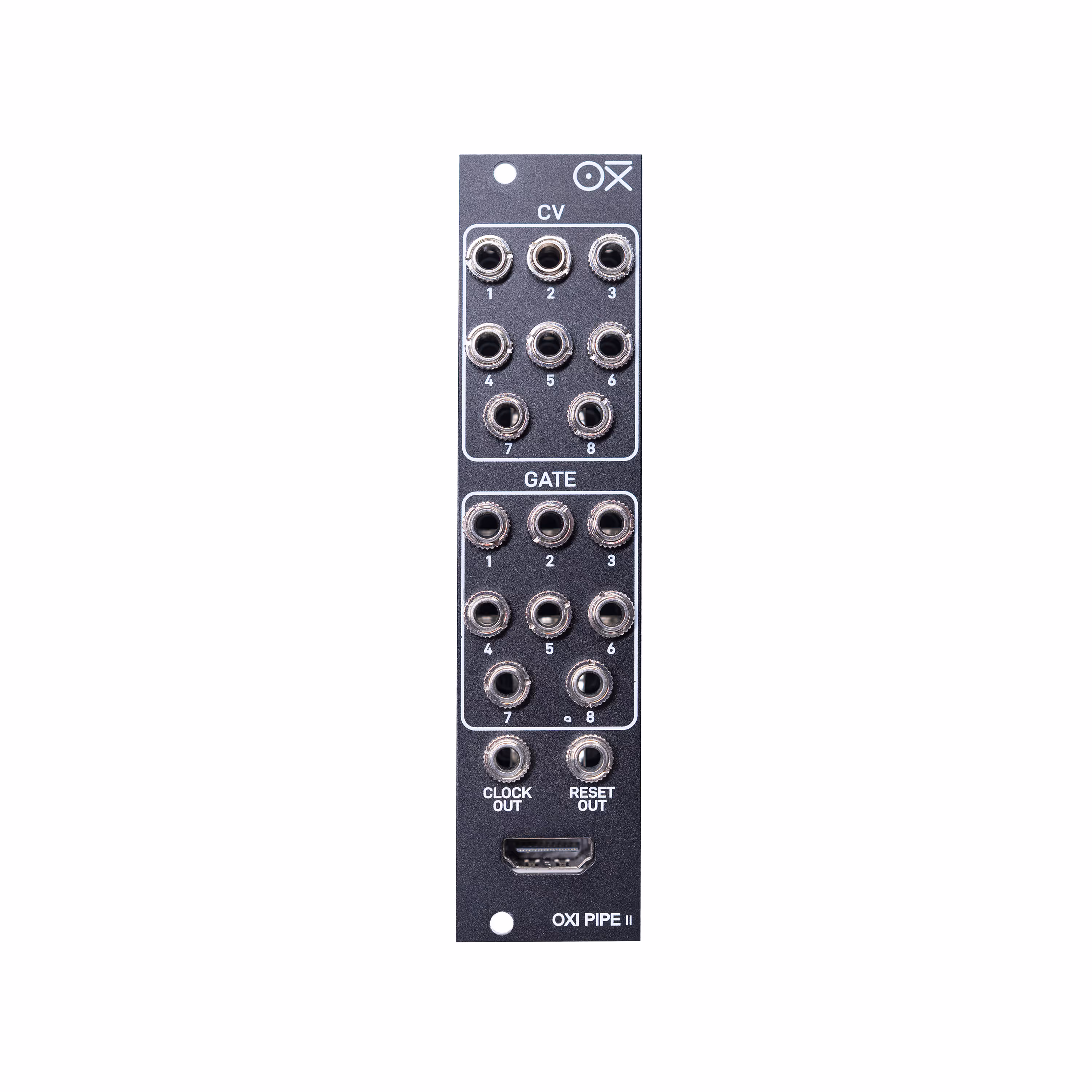 The module, measuring six modules wide and 10 mm deep, requires no power supply and connects to the OXI One MKII via an included miniHDMI-to-HDMI cable. This cable carries all eight CV and eight gate outputs, as well as the reset and clock outputs of the OXI One MKII, into the Eurorack modular system, saving 18 cables and creating a tidy workspace.